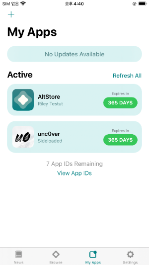 다운받은 다음 바로 altStore 앱으로 돌아가서 MyApp 으로 들어가면 상단에 '+' 버튼이 있습니다. 이 버튼을 누르면