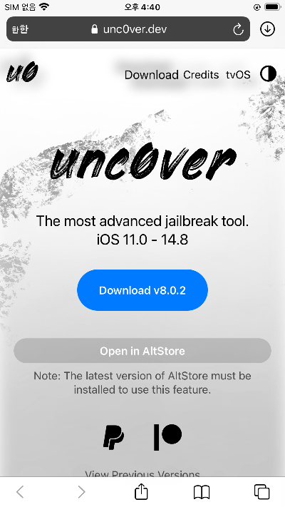 unc0ver 앱이 탈옥을 진행 시켜주는 앱입니다. 이 앱을 테스트 디바이스에 설치하기 위해서 지금까지 준비작업들이 필요했었던 것입니다. 사이트에서 보면 알겠지만, 최신 iOS 버전에서의 탈옥은 지원하고 있지 않습니다.